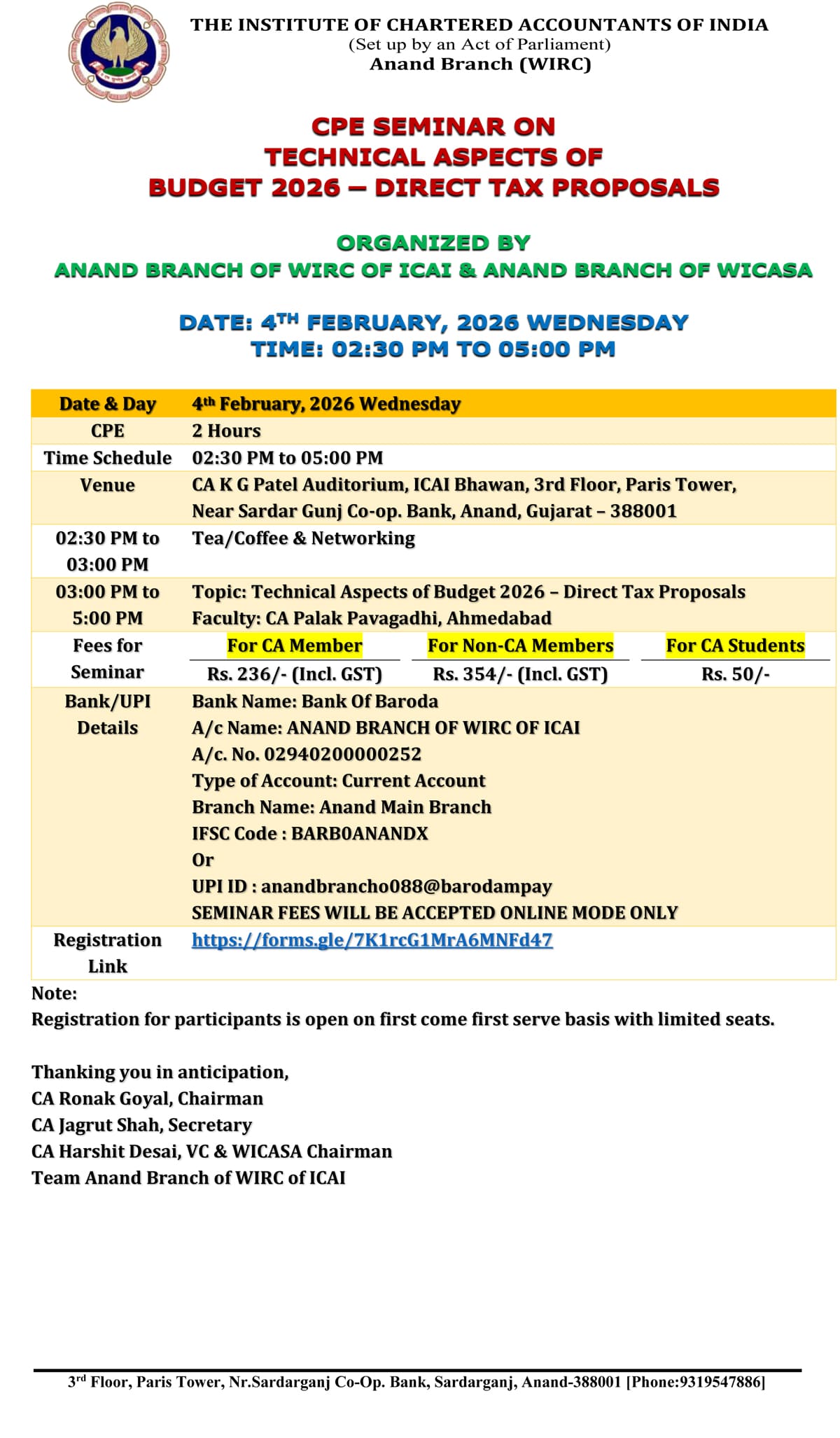 Registration Fees: For CA Members: Rs. 236/- (Incl. GST),